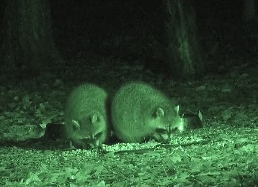 The cat (that is Janie's new target), the possum eating the lamb bone, a quick stop by the rabbit and two raccoons who must have eaten well over Thanksgiving - given their size, all came to visit last night......