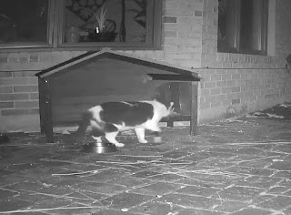 Busy night at the cat shelter. Grey-fluffy cat goes in at 9:00pm, then Flash decides to check out what's happening. Not good at first, but then they seem to get along. Finally, Grey-fluffy leaves at midnight. Good, it's getting used.